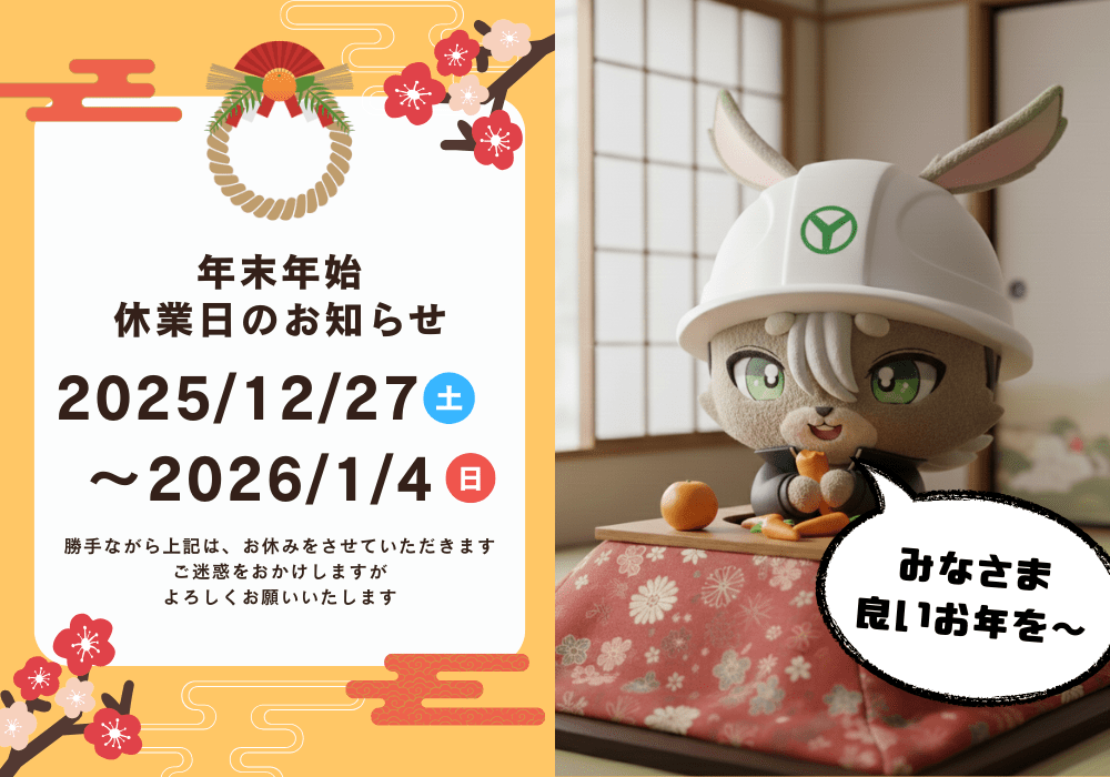 年末年始休業のお知らせ 平素は格別のご高配を賜り、厚く御礼申し上げます。誠に勝手ではございますが、下記期間を年末年始休業とさせて頂きます。休業日:2025年12月27日(土)~2026年1月4日(日)※2026年1月5日(月)より平常通り営業致します。