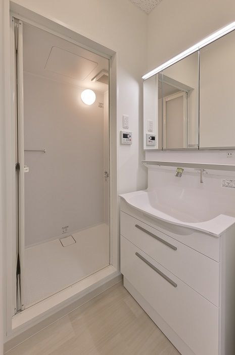 洗面脱衣室にはちょっと大きめの洗面化粧台を設置し、浴室入口と化粧台の間に収納を配置しました。入口横に配置することでタオルなどを取りやすくしています。