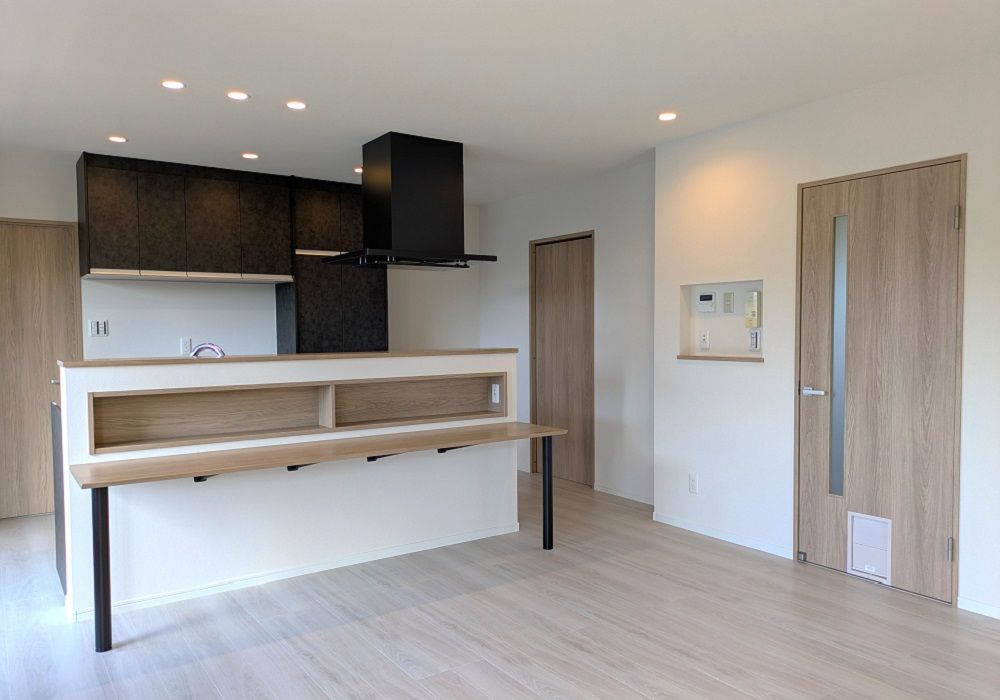 和室と寝室を一部屋にしたLDKはグレージュ×ブラックでコーディネートし落ち着いた雰囲気のお部屋に仕上がりました。対面キッチンには手元隠しの造作壁を起こし、カウンターを取り付けました。カウンター前には調味料をしまえるニッチ収納を設け、両サイドにはコンセントを設置し充電もできる様になっています。猫ちゃんが自由に行き来できるようつけたくぐり戸はすぐに使い始めてくれたそうで安心しました!
