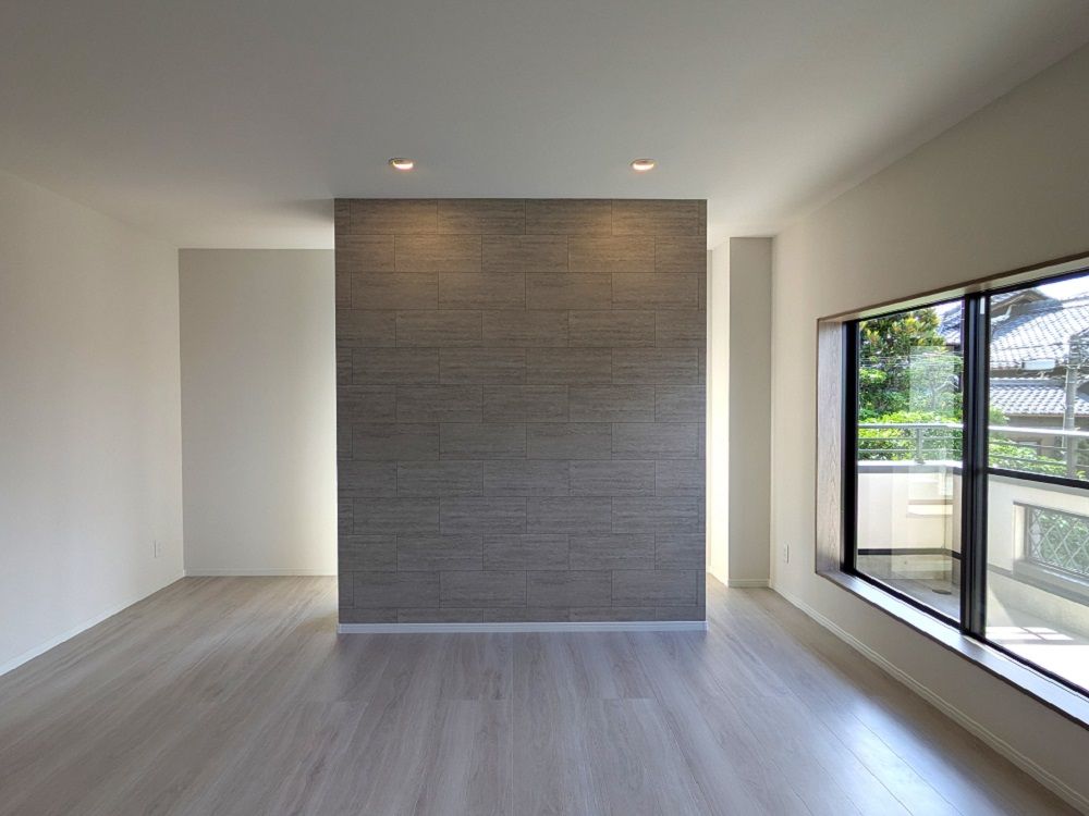 壁掛けTV用の造作壁はタイル調のアクセントクロスを貼り、ダウンライトで照らすことで高級感とお部屋の顔として存在感を出しました。