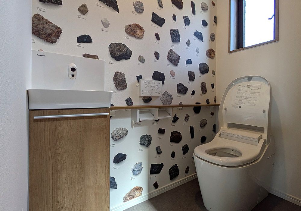 便器はお掃除がラクになるアラウーノを採用、専用カウンターで手洗付きながらにスッキリ納めました。岩石が並ぶアクセントクロスは知的好奇心をくすぐります!