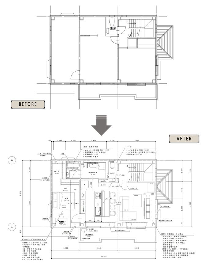 実家へ引っ越し親と一緒に住むにあたり、お互いに気を使わなくていいよう水回り設備を増設、家族が過ごしやすいよう間取りを変更したい。とのご依頼を頂きました。